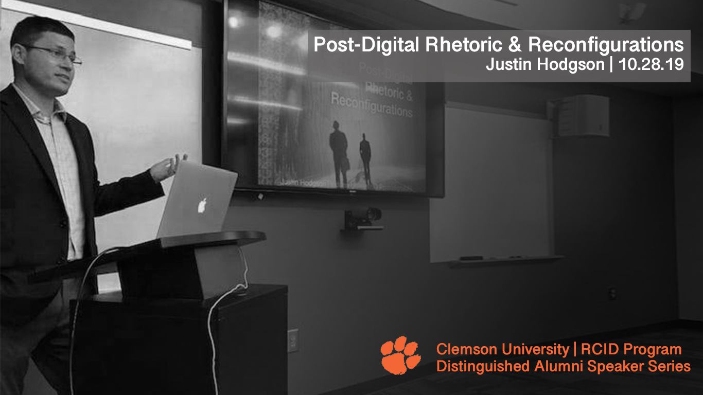 In addition to the fanfare of homecoming weekend and being able to network with current students and faculty, I was also happy to share my research with them. My talk, “Post-Digital Rhetoric & Reconfigurations,” provided something of a crash course introduction to my book, Post-Digital Rhetoric and the New Aesthetic. The time frame prevented something of a deep-dive, but I did try to highlight how shifts in human-technology relationships fundamentally alter how we think about the doing of rhetoric in the 21st century. More specifically, I introduced the four contours of the New Aesthetic and tried to situate how they can inform contemporary digital practices.