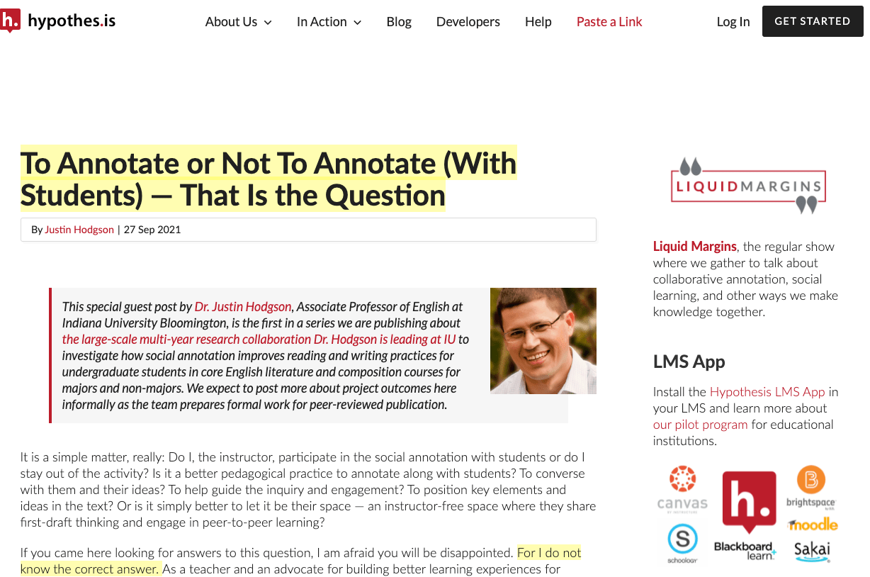 A few weeks back we published two blog posts at hypothes.is related to our social annotation research. The first was a piece where I wrestled with the tension of whether or not to annotate with students (from pre-seeding a text to real time engagement). As part of that piece, several members of the research team chimed in, offering their pedagogical insights and views. Then as a kind of complement to that, Remi Kalir, who is essentially a co-PI with me on the study, offered a post providing some of the early data about the study: 1000 total participants, 20,000 annotations, and the like. I kicked in some insighst into the top annotated texts that post kind of sets stage for what we are dealing with.