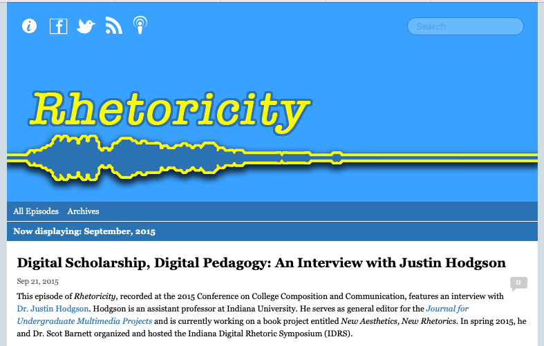 This is a bit of “back filling” in terms of my website, as I’m trying to create content pages or posts for the various items I share. That said, I wanted to take a few moments and create a page here for the Rhetoricity podcast by Eric Detweiler, where I was a featured guest back in 2015. In that episode, Eric and I discussed the Indiana Digital Rhetoric Symposium that Scot Barnett and I co-hosted as well as my ideas around and implementations of “gaming pedagogy” — with a specific look at my rhetoric, play, and games course, which I originally created as a faculty member at UT Austin and transformed further when I moved from UT to Indiana.